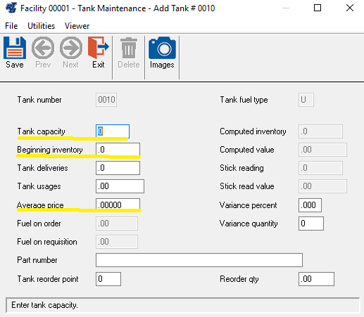 - Key the appropriate information into the “Tank Capacity”, “Beginning Inventory” and “Average Price” fields. The “Part number” field is used if you are tracking fuel purchases through purchase orders. NOTE: Do not enter anything into the “Tank Deliveries” or “Tank Usage” fields at this time; they will be updated by the system.