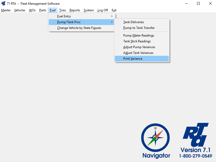 - Select Fuel > Pump/Tank Proc>Print Variance (FPV) from the RTA main menu.