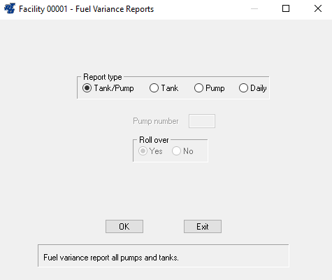 - Select a button to choose the “Report Type”. Select “Tank/Pump” to report variances for all Pumps and Tanks. Select “Tank” to report variances for all Tanks, or select “Pump” to report variances for one Pump and the Tank to which it is attached.