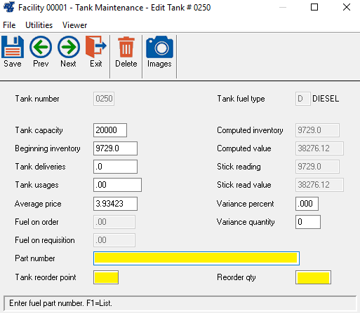 - The Tank Maintenance screen will be displayed. Key in the “Part number” for the fuel in this tank or press “F1” for the lookup list. Key in the “Tank reorder point” and “Reorder qty”.