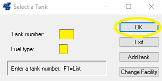 - In the “Tank Number” field, key in the number of the tank receiving the delivery. In the “Fuel Type” field key in the single upper-case alpha character for the type of fuel being delivered. Select the “OK” button.