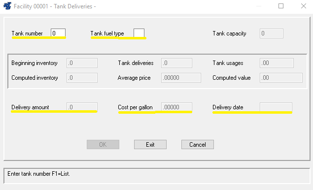 - Enter a “Tank Number” or press “F1” and use the lookup list. Enter the “Tank Fuel Type” or press “F1” and use the lookup list. Enter the “Delivery Amount”, the “Cost Per Gallon” and the “Delivery Date”.