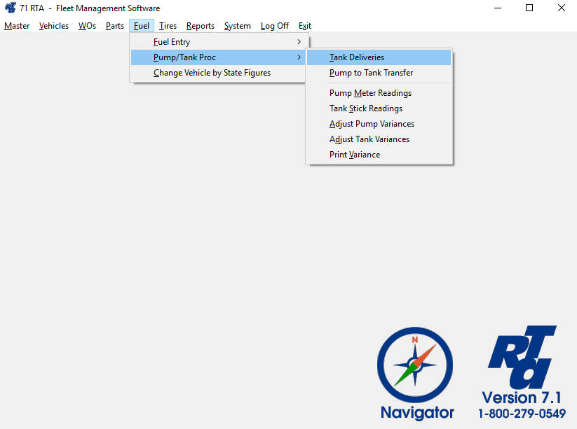 - Select Fuel > Pump/Tank Proc > Tank Deliveries (FPT) from the RTA main menu.
