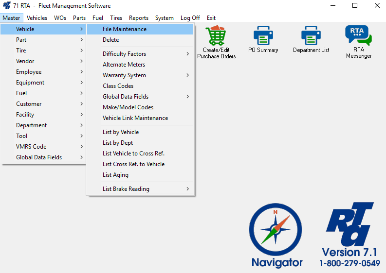 - Select Master > Vehicle > File Maintenance (MVM) from the RTA main menu.