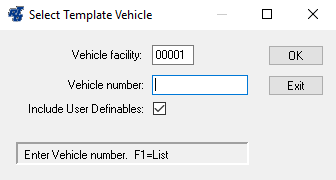 - If you use a template, you will be prompted for the Vehicle Number you wish to use for the template. You may enter the Vehicle Number, or press ”F1” to select from the lookup list of your existing vehicles in the RTA system. Leaving the “Include User Definable” box checked will also copy the data from the “User Defined” tab of the template vehicle. Uncheck the box if you wish to use the default field descriptions in the “User Defined” tab for the vehicle being added.