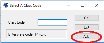 - If you are using an existing Class Code as a template, select the Existing Class radio button, and press the enter key to advance the cursor to the Template Class Code field. Key in the Class Code you wish to use as a template, or press “F1” to view the lookup list of Class Codes. Double-click on the appropriate Class from the list, and then select “OK”.