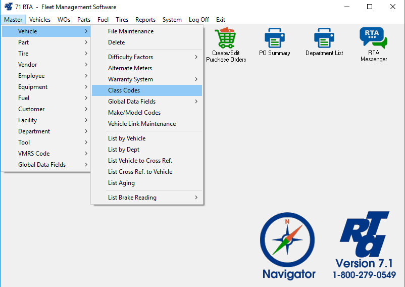 - Select Master > Vehicle > Class Codes (MVC) from the RTA main menu.