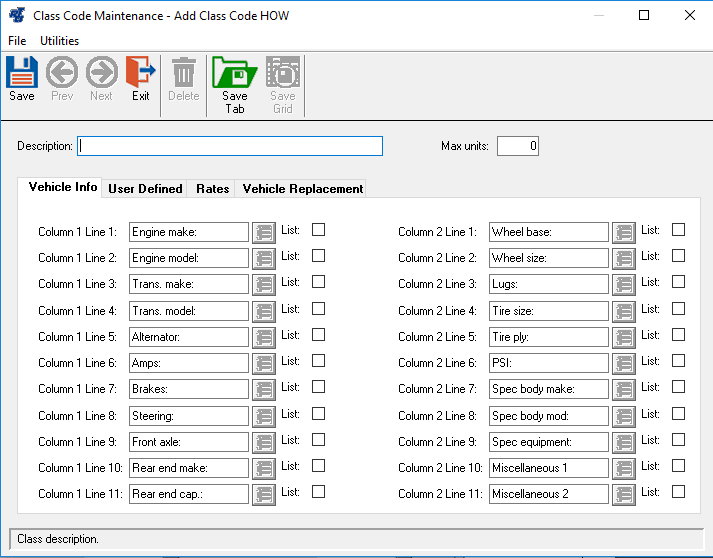 Vehicles can be grouped into classes for reporting purposes. Class Codes are used by the entire RTA system and are not Facility specific. Within each Class of vehicle, maximum units are used for odometer input validation. Additionally, description fields define what information is prompted for in the Class Info Tab of the Vehicle Master File. Also, checking the “List” box allows you to limit data input in the respective field.