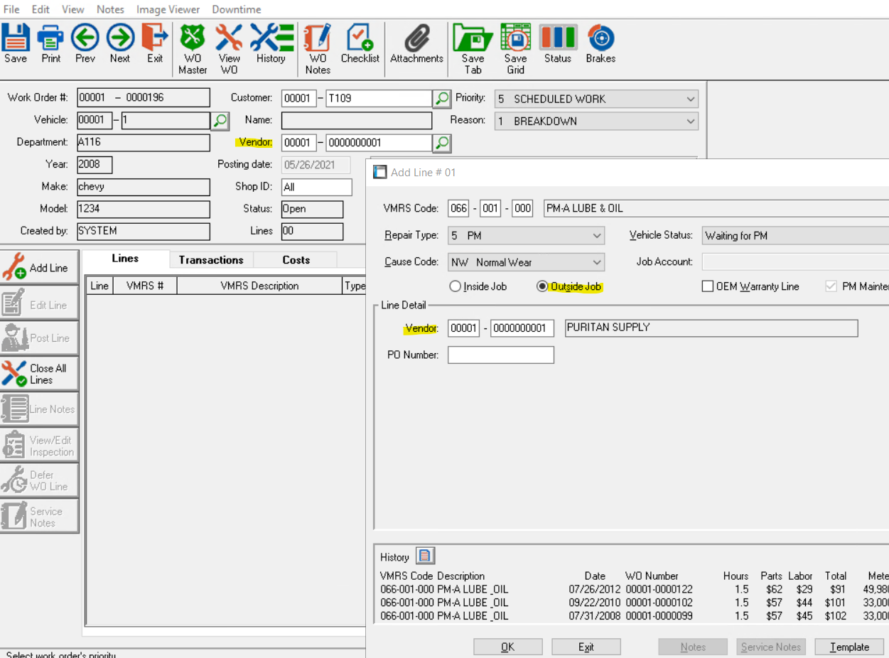 WOs > WOs > New WO > enter the vehicle number > Input the Vendor that will be doing the job > Add Line > Specify an Outside job
