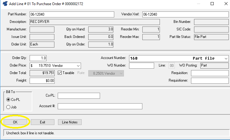 Select the “OK” button to complete the data entry for the line and you will be prompted for another Part number to be placed on the next line of the PO.