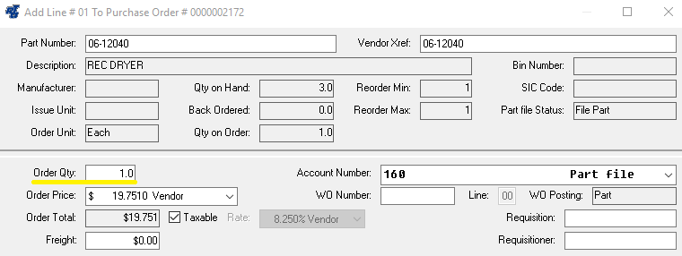 - The “Order Qty” will default to the Re-Order Quantity from your Part file but you can edit this field, keying in the Quantity to match the vendor’s invoice.
