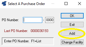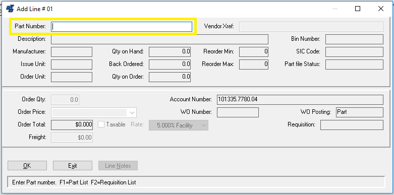 To add another Part to a new line, repeat steps #4 - #10. When all lines have been added, select “Exit” to return to the main Purchase Order screen.