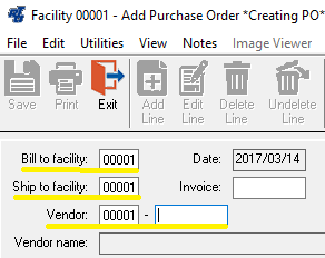 - Select your bill to and ship to facility and then key in the “Vendor Number”, or press “F1” for the lookup list. You can also enter in your Invoice number