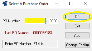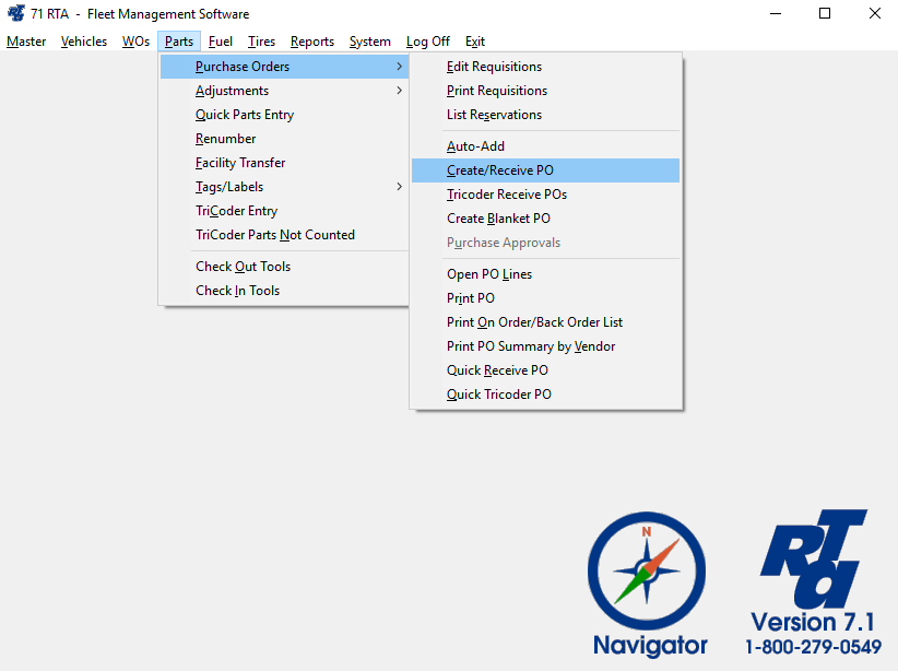 - Select Parts > Purchase Orders > Create/Receive PO (PPC) from the RTA main menu.