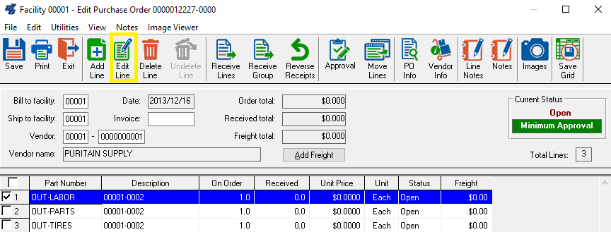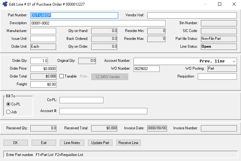 - The Edit Line screen will be displayed. Here you can edit any of the fields related to this line. When finished making changes, select the “OK” button to return to the main Purchase Order screen.