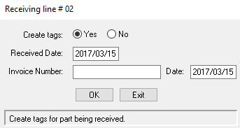 - If you select “No” you will be given the option to receive less than what was originally on order. In the next screen, today’s date populates the two date fields by default. The Received Date field is the date the merchandise was received. Edit the Received Date as appropriate. Key in the Invoice Number, as it appears on your vendor’s paperwork. Key in the Invoice Date from the vendor’s paperwork in the Date. When all fields are correct, select the “OK” button. NOTE: RTA uses the Received Date and the date the Purchase Order was created to calculate the Shipping Days for the purchase of each part