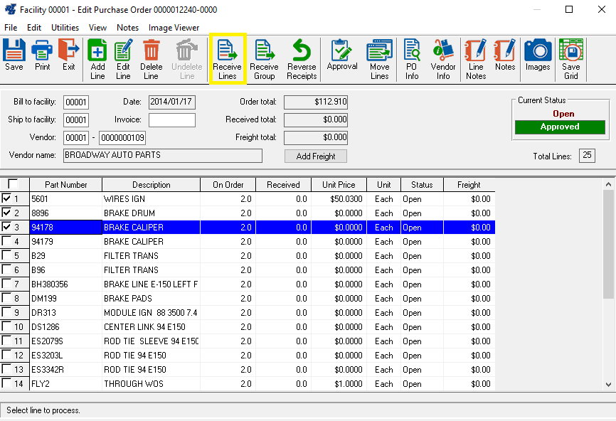- Select the checkbox to the left of each line you wish to receive into inventory and select the “Receive Lines” button.