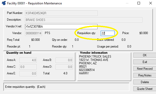 - The information for this requisition will populate the fields in the Requisition Maintenance window. Key in the desired quantity in the “Requisition qty” field. Select “OK” to save the requisition.