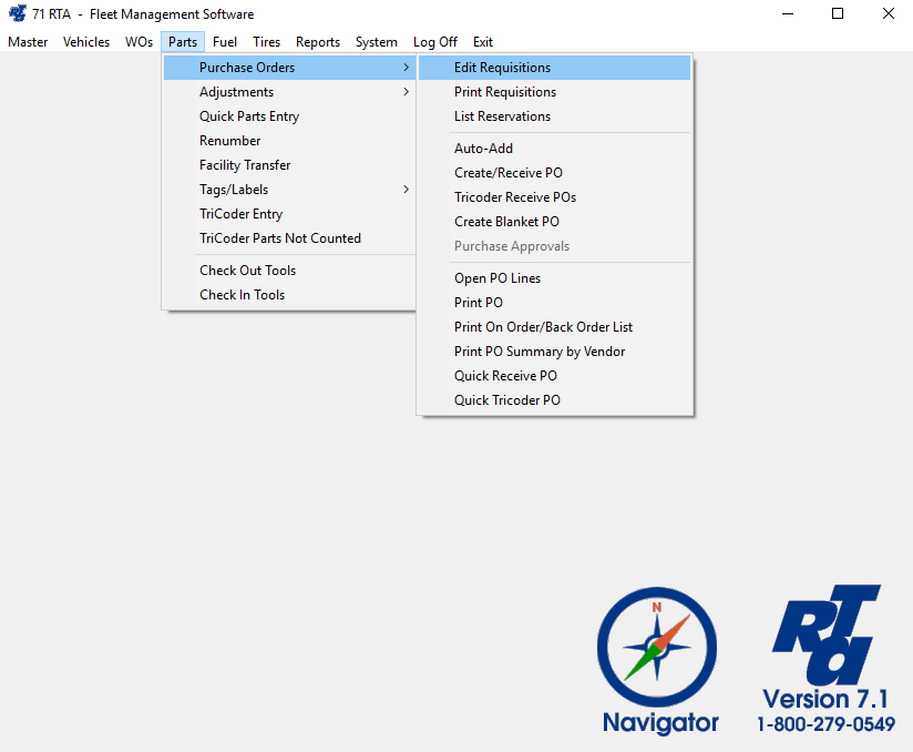 - Select Parts > Purchase Orders > Edit Requisitions (PPE) from the RTA main menu.