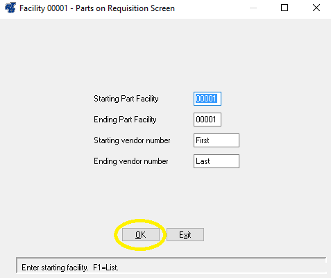 - Key in the desired “Facility” and “Part” ranges. Select the “OK” button.