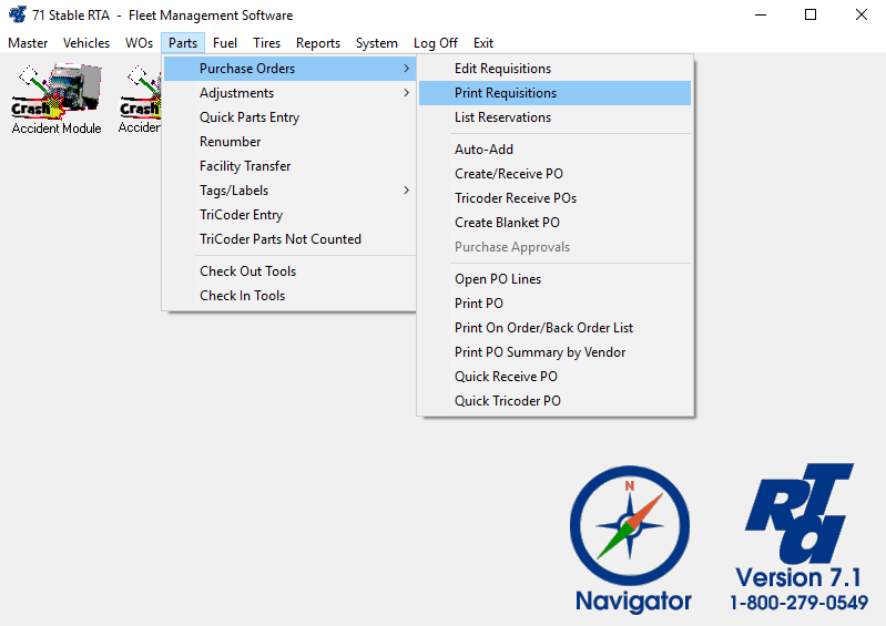 - Select Parts > Purchase Orders > Print Requisitions (PPP) from the RTA main menu.