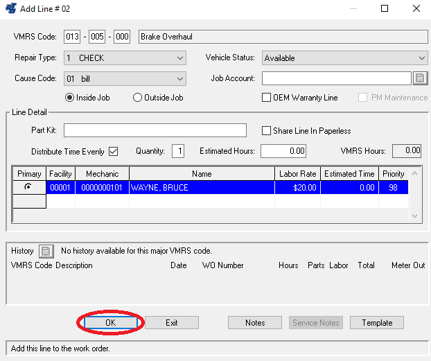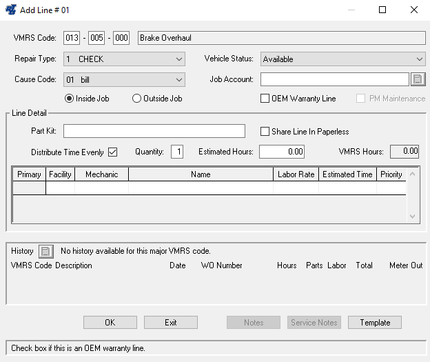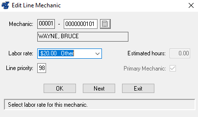 Enter the information into the fields of the "Add Line" window. You will notice the screen has changed from previous versions. You can now add more than one mechanic to the line and the navigation has changed some. Please click to expand a description of each field