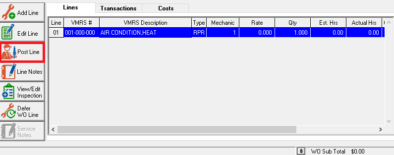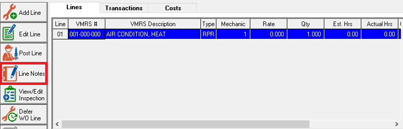 - Highlight the job line to which you will post Parts or Labor and select the “Line Notes” button.