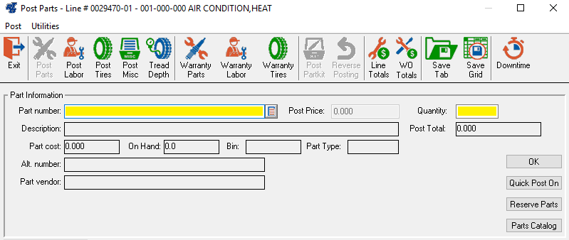 Once the Work Order has been created and the work has been completed, you can then record the Labor hours, Parts used, Tires mounted, and Misc. charges and credits.