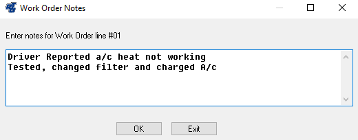 - Enter notes for work completed as desired (Typically: Complaint/Cause/Correction). Select the “OK” button.