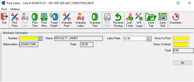 - Enter the Mechanic Number if this job has not been assigned already. "Hours to Post" is billable hours and "Hours worked" is actual worked hours. If billable hours and worked hours are always the same, just put in hours to post and select the "OK" button. If this job was specified as an Outside repair, you will be prompted for your Vendor labor costs instead of Mechanic information.
