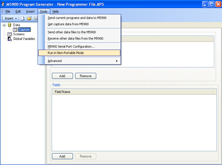 The M5900 Program must be put in Non-Portable Mode along with the M5900 Handheld.