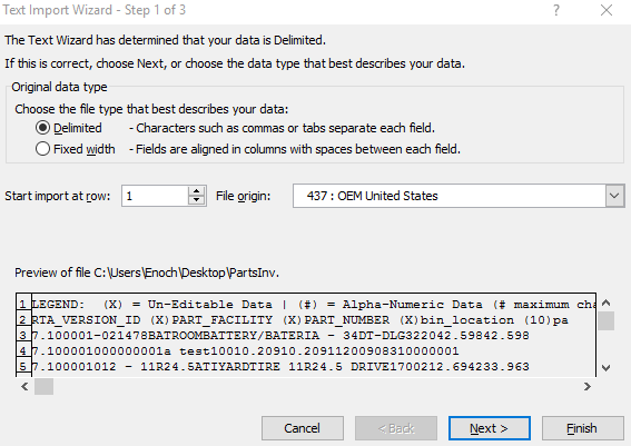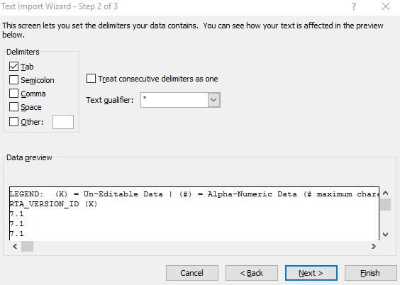 Select "Yes." and a text Import Wizard will show up.By default, you should be able to click 'Next' through Steps 1 & 2, but just to confirm, Step 1 of 3 should be set to "Delimited". Click Next.