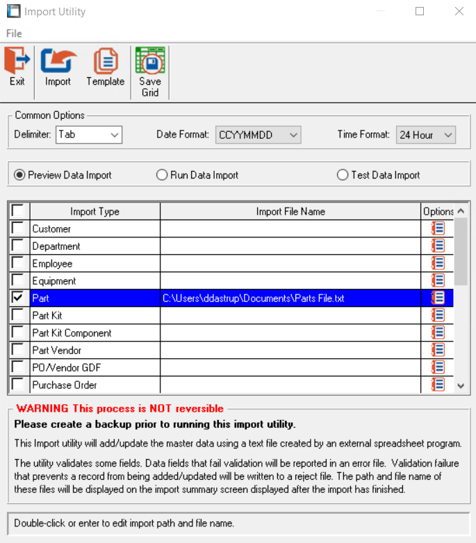 Check the File(s) to Import, set the Options and double-click the Import File Name column to chose the proper file. It is advised to Preview the data, Test the data, then Run the Data Import, in that order. This provides the opportunity to see errors or rejected files. Once run, this process is NOT reversable.
