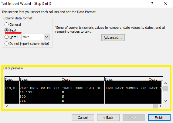 In Step 3 of 3 of the Import Wizard, there is a 'Data preview' pane shown at the bottom. Drag the scroll bar at the bottom of this display all the way to the right. In the very last column, hold down the shift key and click your mouse at the top of the last column. This should select or highlight all columns in black. Finally, select "Text" for the Column data format. This will change all of the column headers to 'Text'. Then click "Finish."