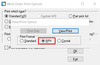 Select your print type (in the case of a WO) and select “OK”. Then select the RPV print format when prompted. Select View/Print.