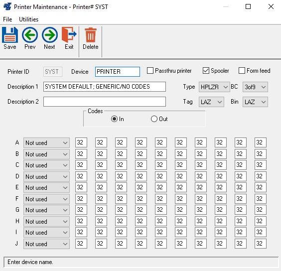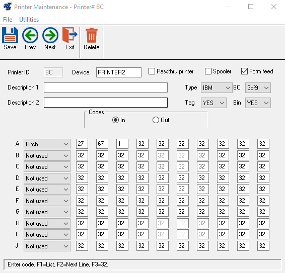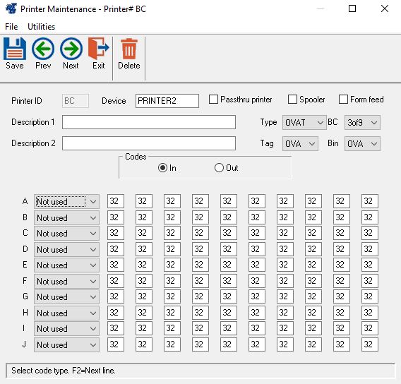 Example: The thermal printer as shown above is a direct-spooled printer. This means that RTA will send all control codes needed to the printer. Setup should follow the above print screen (BCTH). DEVICE is set to PRINTER2, which is defined in the cblconfi file as -P SPOOLER-DIRECT. Ptr Type should be set to OVAT, which denotes a thermal printer. Tag should also be Ova for the thermal printer. Printer control codes Codes IN and Codes OUT are not used and should be left as 032.
