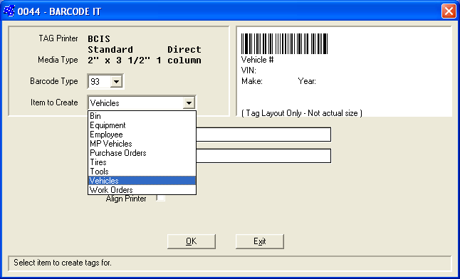 This program will initialize to the Tag Printer defined in the user record. This allows the user to pre-define the RTA printer settings for BarCode It.