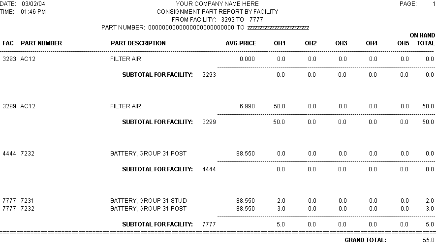 This is similar to the Consignment Part List but it is formatted as a Crystal Report and includes a report header, subtotals by facility, and grand total.