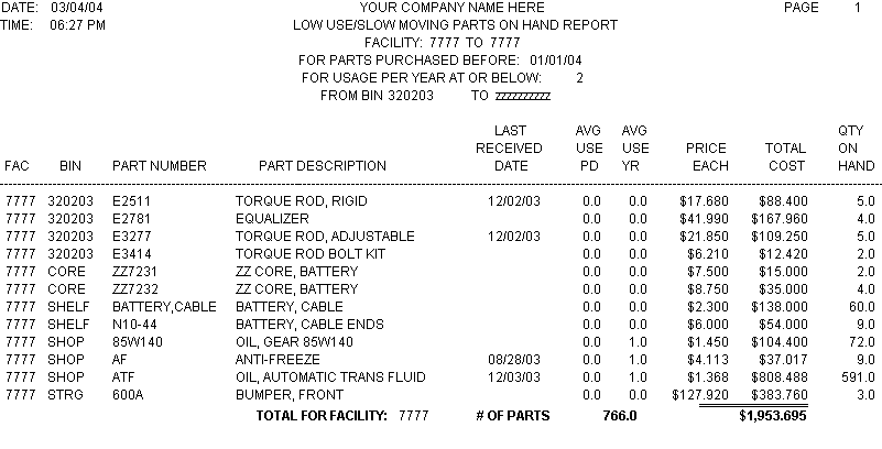 This report prints out a list of parts that are in inventory that have a year usage less than or equal to a user prompted number and were last received prior to a user prompted date. You are prompted for a facility and bin range, as well as a threshold date (will be used to pull last purchases prior to this date), and a usage number.
