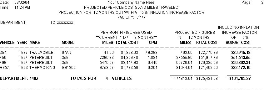 This report calculates a monthly miles and vehicle costs based on the yearly totals divided by the number of months since the last end of year process. Then these figures get extended out for the number of months the user inputs into the report prompt. Also in this report you can factor in an inflation percentage to add to the projected total. You will be prompted to select a facility, months since the last year closing, starting and ending department range, the number of months to project out, and inflation percentage.
