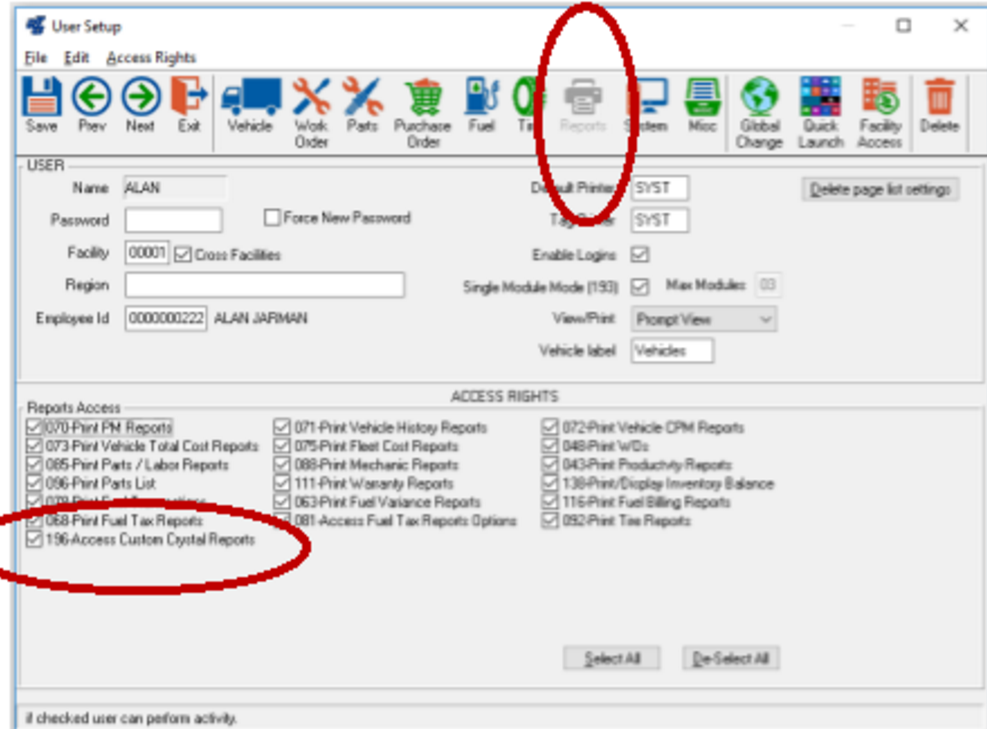 Users Access Rights (SUM): Users can be enabled or disabled from accessing the Custom Crystal Reports menu option. In Setup Users File Maintenance (SUM), select the “Reports” icon in the top tool bar to open the Reports Access Rights. Line# 196 must be checked to allow the user access to “Custom Crystal Reports” (RY). If the box is unchecked, the Custom Crystal Reports (RY) will be grayed out and the user will not have access to Custom Crystal Reports.