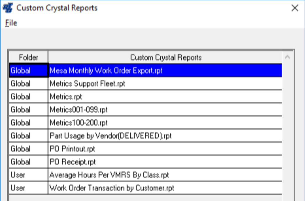 Reports copied in the “Custom Crystal Reports” directory are shown in the Folder column as “Global”. Reports copied in the JOHND directory are shown in the Folder column as “User”