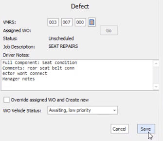 With the proper line selected, you can use the “Defect” view to establish a VMRS code (F1 lookup list enabled) and add/edit any notes placed on the original Driver Report. After selecting the line, simply click Edit in the Defect box and input the needed data. From here you can also assign the Work Order vehicle status.