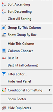 Also available from this menu is the Column Chooser, which allows the user to select additional columns to view by double-clicking the name or dragging the name to the grid. The columns can be rearranged, sorted, and filtered.