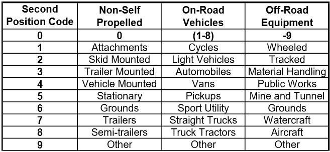 The NAFA Standard Vehicle and Equipment Classification Code is a four position numeric coding system that potentially accommodates up to 9999 vehicle classes. The codes are consistently organized within broad segments of the class codes facilitating manipulation within databases. The code names are designed to be intuitive and self descriptive. The code system is configured as follows: