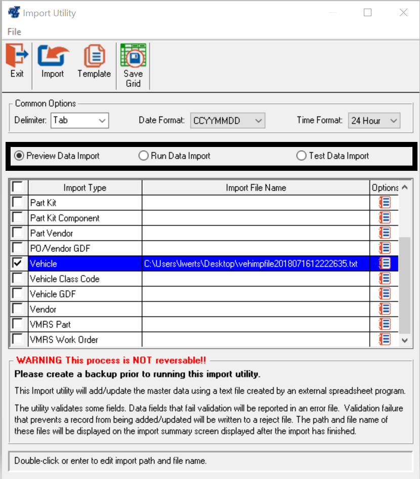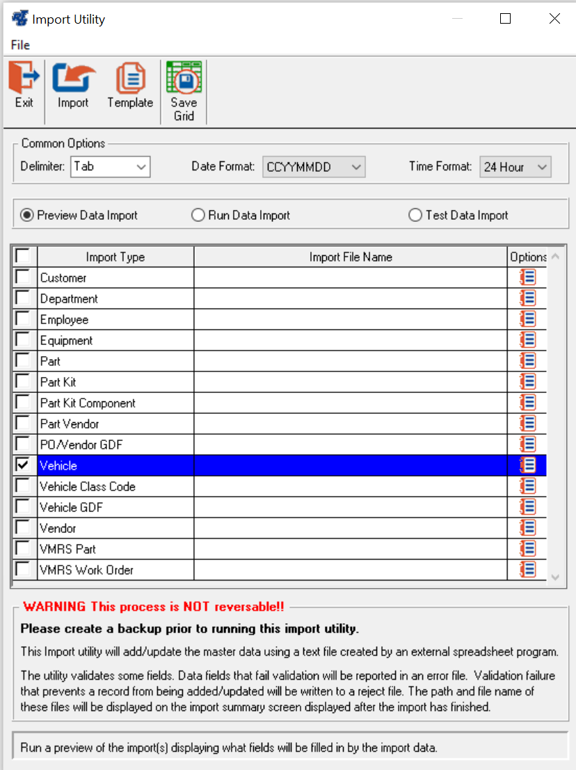 This utility allows you to import master information from a text file into RTA for, Customers, Departments, Employee, Equipment, Part, Part Kit, Part Kit Component, Part Vendor, PO/Vendor GDF, Purchase Order, Purchase Order Lines, Purchase Order Notes, Purchase Order Transactions, Vehicle, Vehicle Class Code, Vehicle GDF, Vehicle PM, Vendor, VMRS Part, Work Order, Work Order Lines, Work Order Line Mechanic, Work Order Transactions and Work Order Notes.