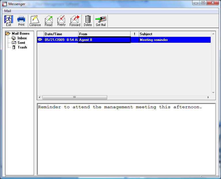 To access the Messenger main screen by clicking the "RTA Messenger" button or, go to System>RTA Information>Messenger (SAG). From here, they can compose, read, reply, forward and delete messages. These features function much like the full-featured email programs you are familiar with. All received messages are stored in the Inbox. Copies of previously sent messages are stored in the Sent folder. Deleted messages are stored in the Trash folder. Messages can be permanently removed by deleting them from within the Trash folder. The "Get Mail" button checks for any new messages that have been sent to the user recently and refreshes the inbox.