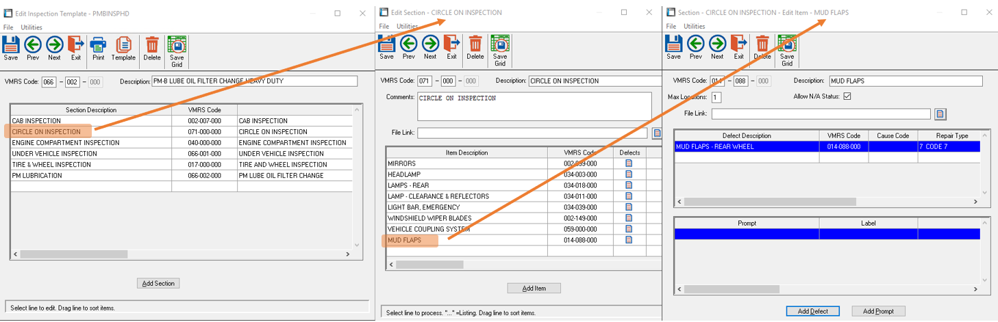 Sections form the different areas of the inspection form. Each section has it's own header identified by a separate VMRS code. Comments can be added to each section, which are viewed by the mechanic during the inspection process. A 'File Link' allows you to attach a document or file to the section for a mechanic to view during the inspection.