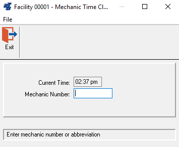 The current system time is displayed along with the mechanic number prompt. For security purposes, a mechanic lookup list is not available here. To clock in, the mechanic simply inputs his number or abbreviation. A verification prompt will be displayed.
