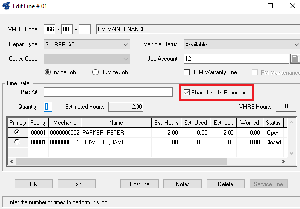 In order to allow mechanics to be able to share their line in paperless shop, there is a a check box that needs to be checked when creating the job line.
